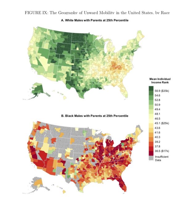 No one can deny the inequality in outcome for many people of color in the U.S., but many deny that there’s any inequality of opportunity, or that white privilege and structural racism exist. If the U.S. then functions as a meritocracy of sorts, any inequality is supposed to spring from something else, such as lower I.Q.s. A recent study (summary), brilliantly covered by the NYT, documents the impact of structural racism on economic opportunity and concludes “The gap in incomes between blacks and American Indians relative to whites is thus likely to persistent indefinitely without changes in their rates of intergenerational mobility.” In particular, Black men are disproportionately impacted: