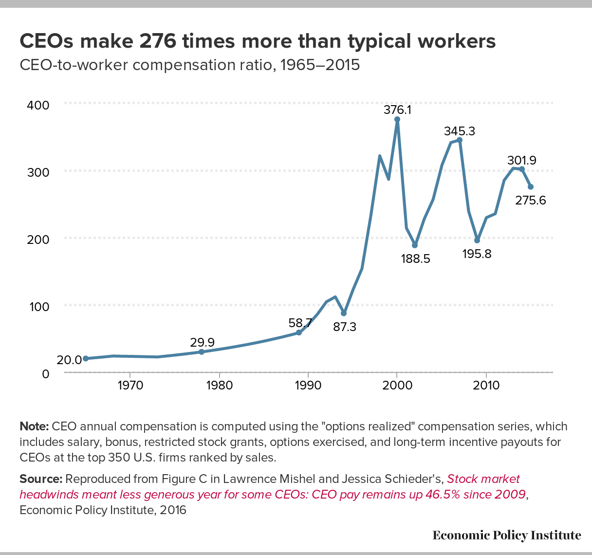 CEOs make 276 times more than typical workers: CEO-to-worker compensation ratio, 1965–2015